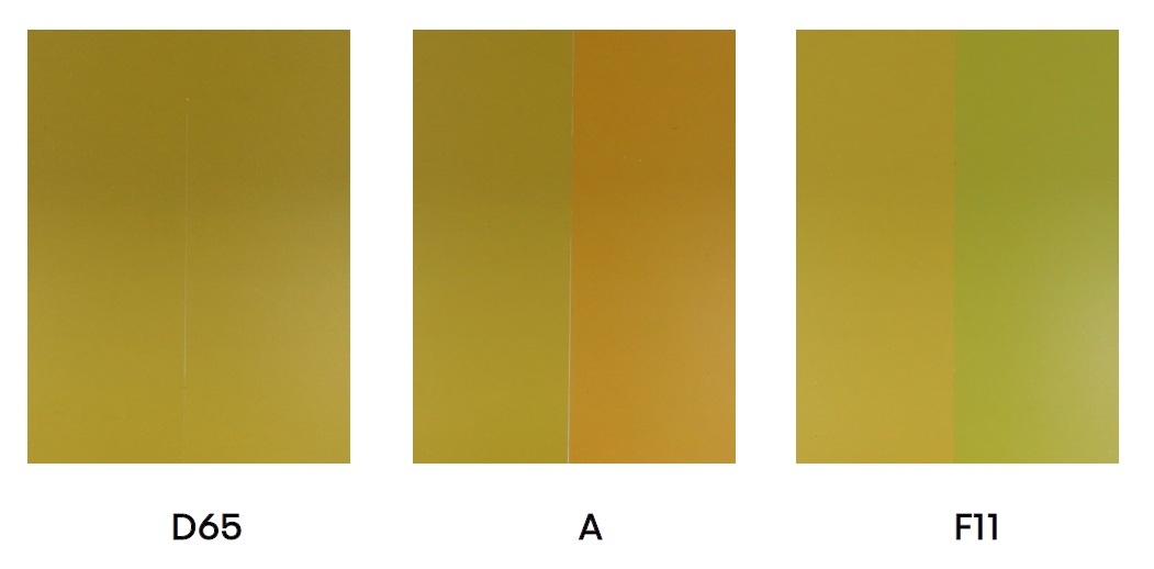 Figure 1. This is three photographs of the colour sample A and B mounted side by side. The first photograph is in daylight (D65), the second in incandescent light (A) and the third in fluorescent tube (F11). In D65 the two samples match, in A and F11 we see a colour difference due to metamerism.