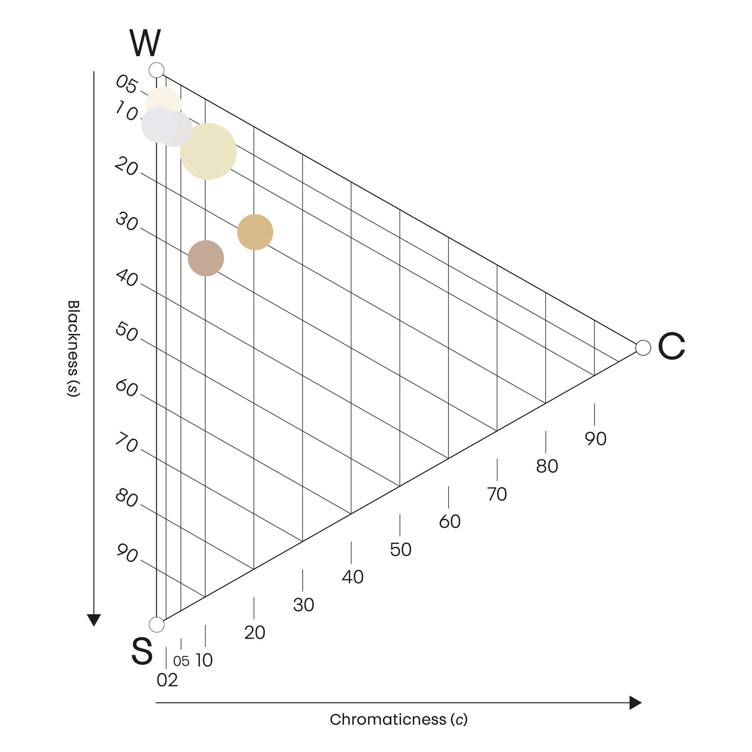 Balancing these warm and grounded tones, NCS S 1001-B, a bluish white introduces a crisp, cool touch, suitable for ceilings or subtle highlights. This gentle contrast keeps the overall scheme fresh and airy, preventing it from feeling too warm or enclosed. It adds a gentle coolness that balances the palette, enhancing the feeling of quiet luxury.