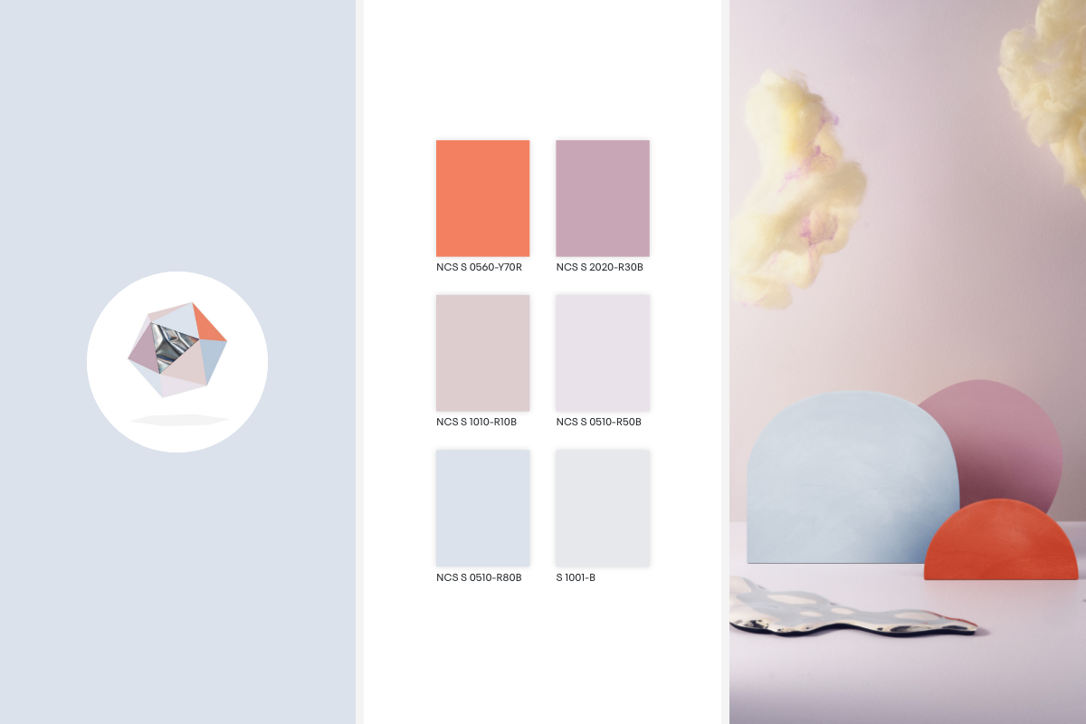 Digital reality introduces us to a world of liquid colours we want to have and adopt in our physical realities. The new kind of sustainable colouring techniques, such as food waste and bacteria, strengthen our focus on low chromatic, airy colours that perfectly represent our feelings of ourselves and where we are. The colours are extremely delicate and light in a way that seems not to be of this world and are described as ethereal and beautiful. The ethereal mood pushes us to use abstract and sometimes playfully absurd shapes. We want to have disproportioned objects. The spaces we create should be dreamy.