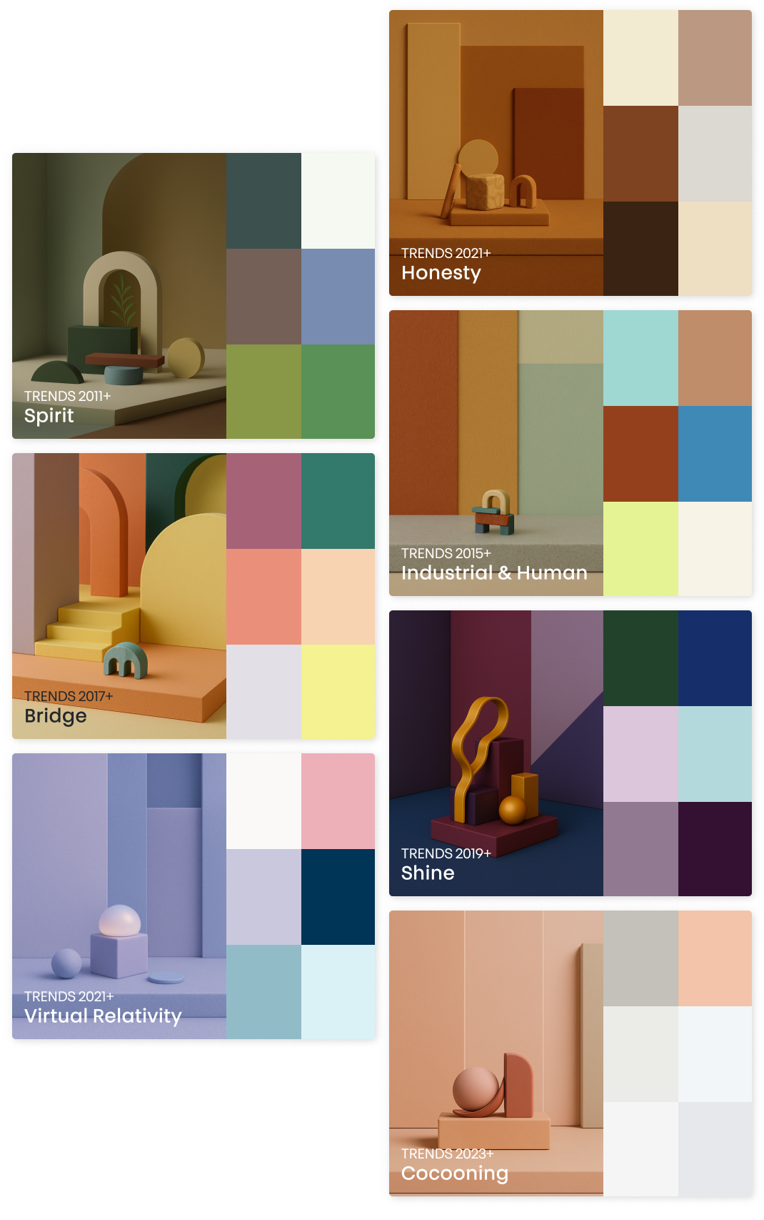 Sedan 2011 har NCS hjälpt designers, varumärken och kreatörer att ligga steget före genom att årligen leverera en färgutblick i samarbete med internationella CMF-experter. Tack vare NCS färgspråk kan varje nyans identifieras och arkiveras exakt. Utforska de fyra distinkta färgdirektionerna från varje år i NCS Trend Retrospective, nu tillgänglig i NCS+.